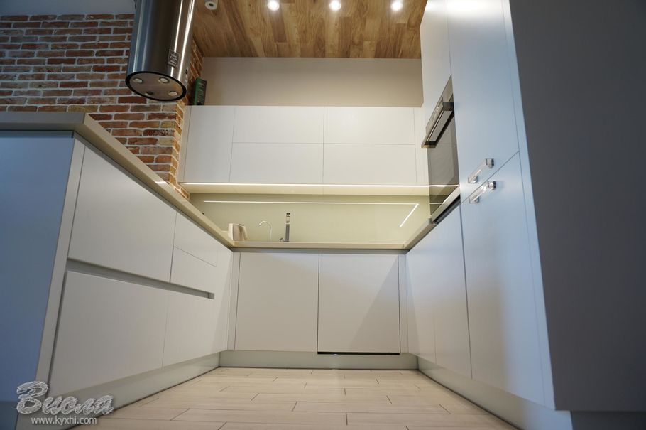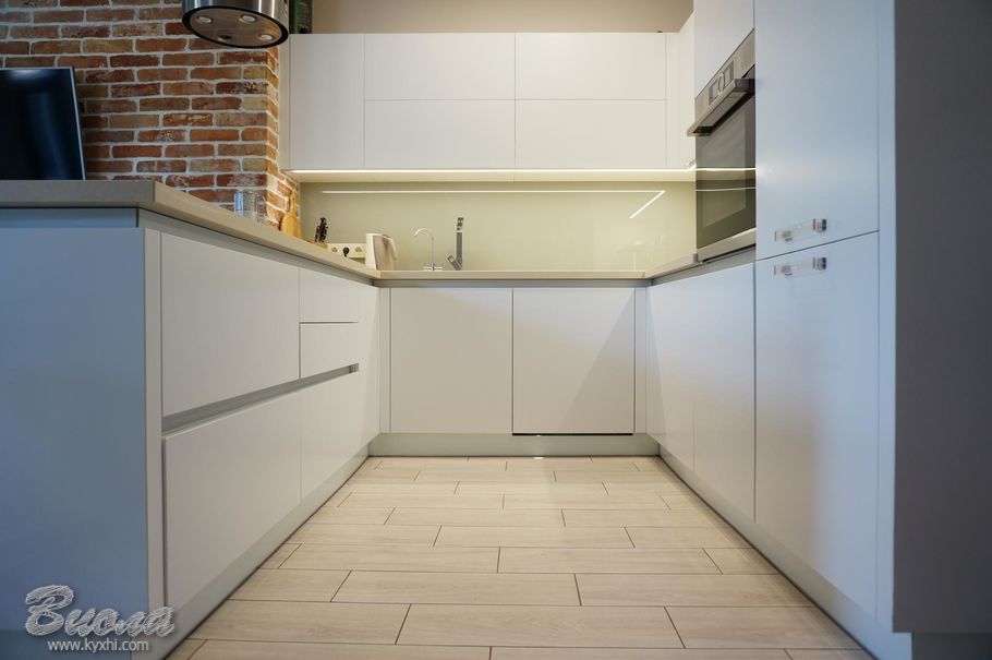 - Біла П-подібна кухня їх МДФ із кварцовою стільницею