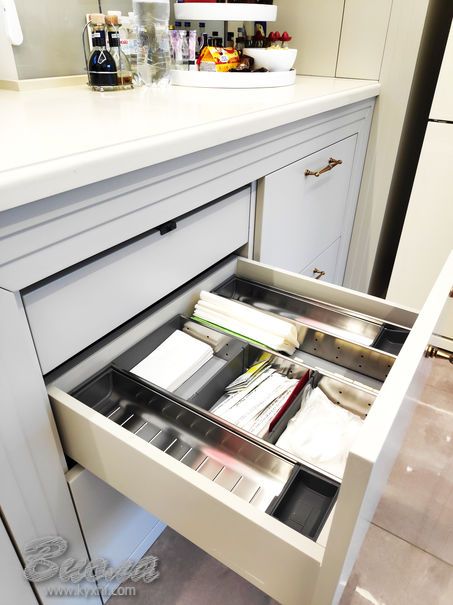 Стільниця з кварцу Caesar Stone (Ізраїль) - це краса і практичність в експлуатації, колір у тій же кольоровій гамі, акцент на змішувачі з бронзи. На підтримку вдало підібрано бронзові ручки на меблях, а також усю побутову техніку італійського бренду Smeg з такою ж фурнітурою. Замовляючи кухню на замовлення у "Віолі", ви отримуєте комплексне дизайнерське рішення всіх її складових (меблі, побутова техніка, сантехніка, а також рекомендації щодо кахлю та електрики).