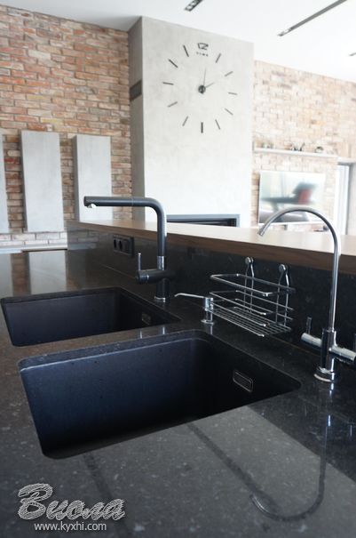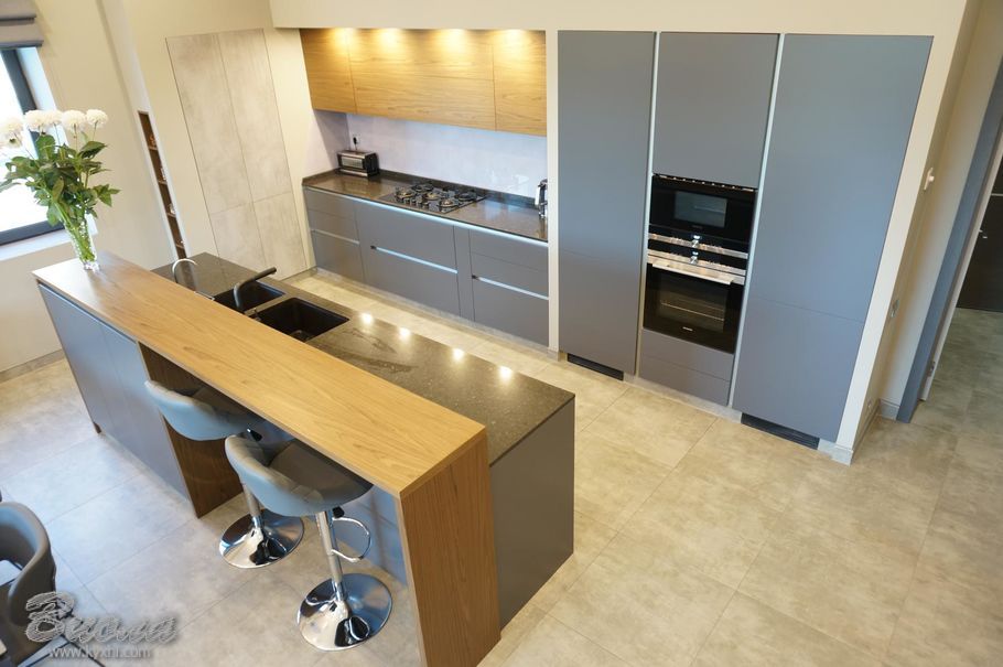 Створюючи дизайн нашої кухні та вітальні ми ґрунтувалися на змішуванні різних архітектурних рішень. На наш погляд дуже вдала комбінація гладких поверхонь у кухонній зоні з цегляною кладкою у вітальні. Фасади також різні за фактурою гармонійно підібрані дизайнером. У даному випадку ми використовували: