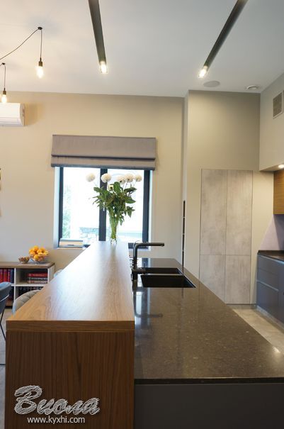 - Кухня в стилі лофт фасади шпон і мдф фарбовані стільниця кварцит